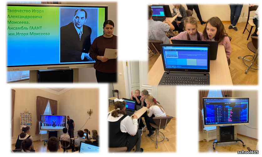 10 февраля 1937 года был основан Государственный академический ансамбль народного танца имени Игоря Моисеева — коллектив, у которого до сих пор нет аналогов в мире. Моисеев создал собственную технику и уникальный метод творческой интерпретации фольклора: в его постановках сочетаются все виды танцев, драматургия, симфоническая музыка и актёрское мастерство. Поэтому даже сейчас, по прошествии стольких лет, ансамбль продолжает гастролировать — и везде собирает полные залы. Ребята посмотрели фрагменты танца «Яблочко» и «Партизаны». Синхронность в танце никого не оставила равнодушным. Полученные знания ребята применили на компьютерном опросе. Занятие было интересное и познавательное.