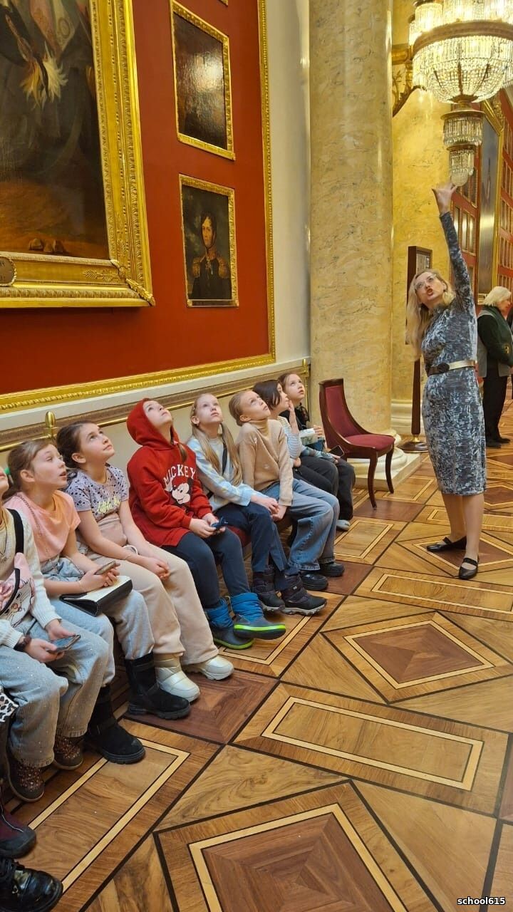 21 ноября ученики 3 "Г" класса начальной школы №615 посетили Государственный Эрмитаж, прослушали экскурсовода и увидели экспонаты по теме: "В мире прекрасного". В начале экскурсии учеников встретила сверкающая золотом Иорданская лестница. Здесь ребята совершили путешествие во времени и прогулялись по парадной анфиладе залов дворца. Их ждали Фельдмаршальский зал, Малый Тронный зал, созданный в память о Петре I, и Галерея 1812 года, открытая в честь Победы над армией Наполеона. Также ученики посетили Гербовый зал, где оказались на торжественном приёме среди великолепного убранства. В самом изящном Павильоном зале они внимательно рассмотрели удивительные часы "Павлин".