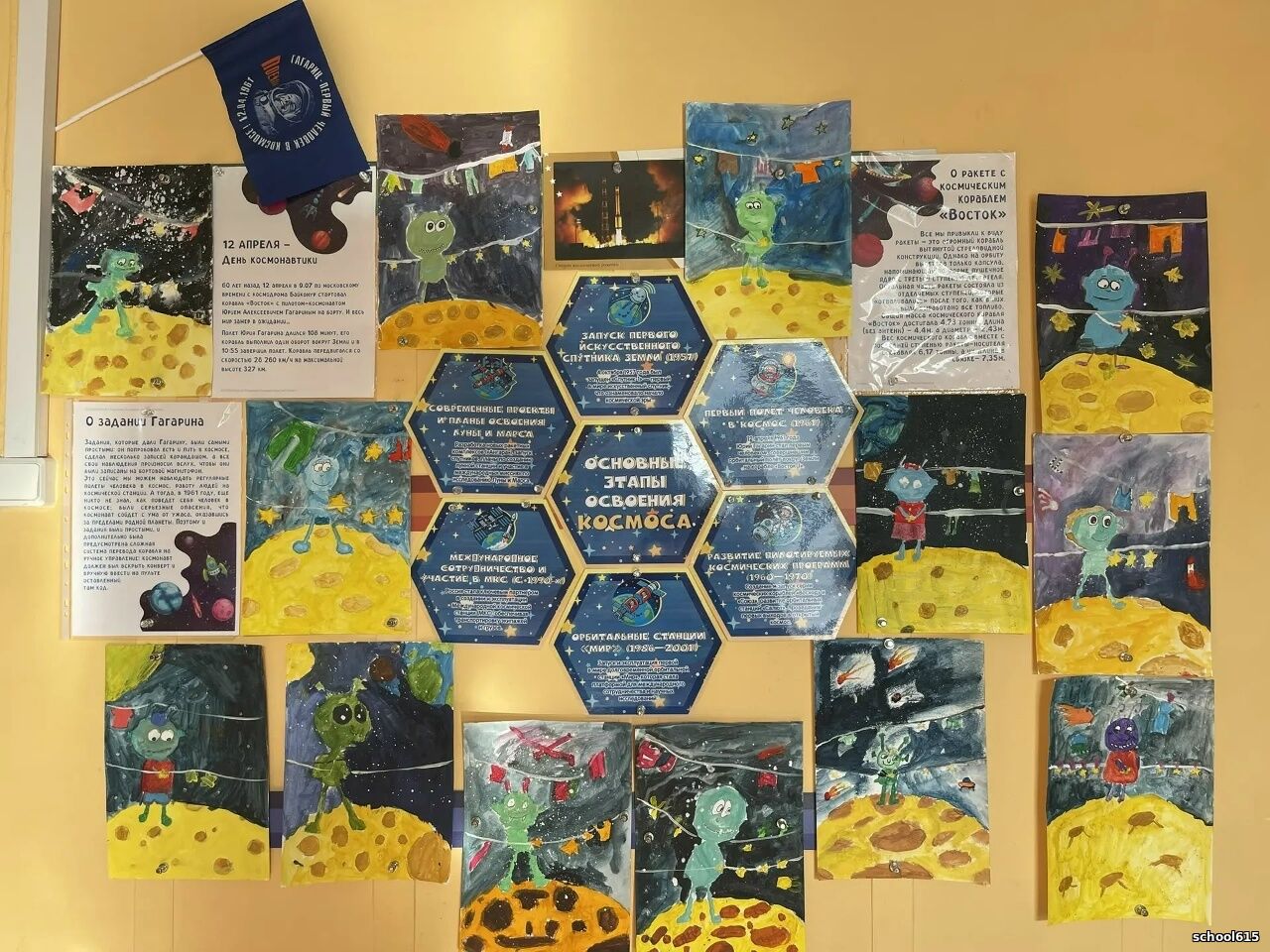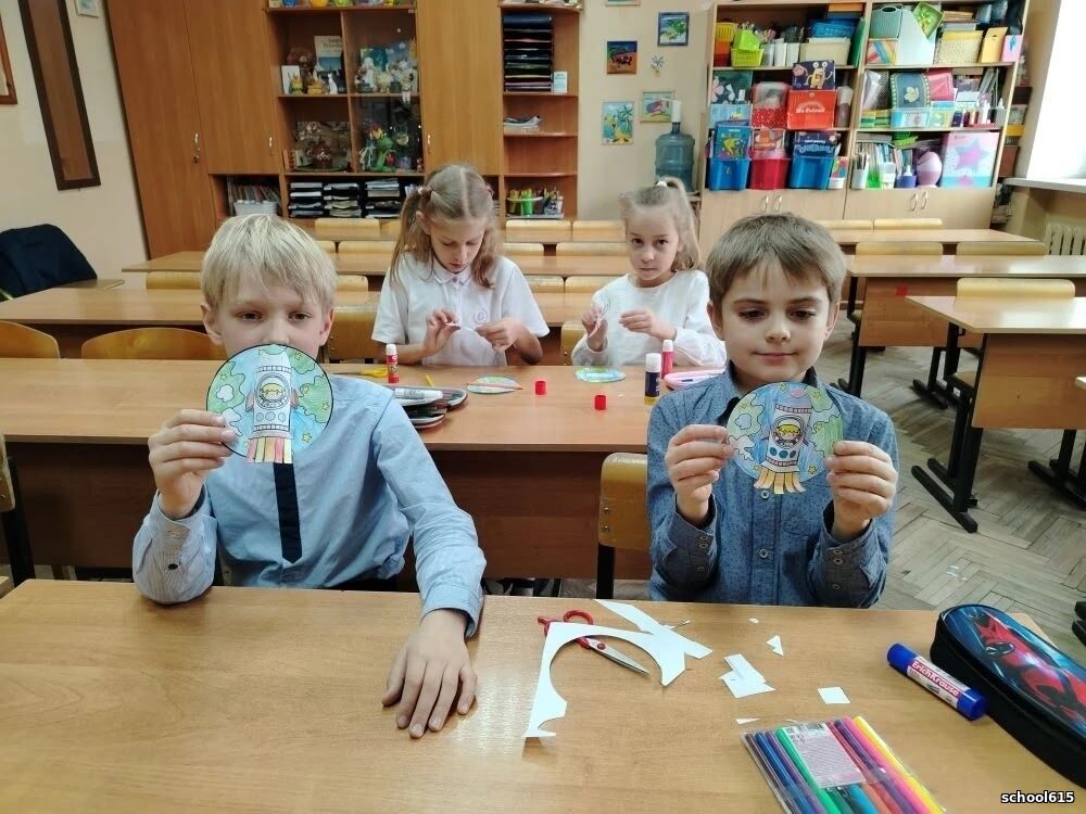 Для обучающиеся начальной школы 615 прошли многочисленные мероприятия: тематические уроки, викторины, конкурсы рисунков и поделок ко Дню космонавтики.