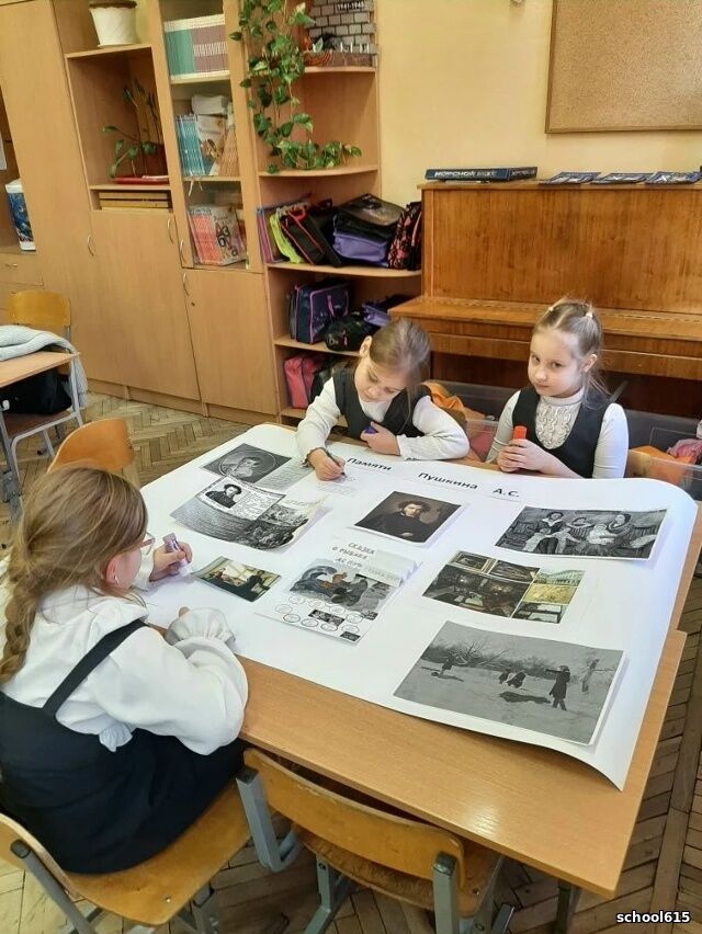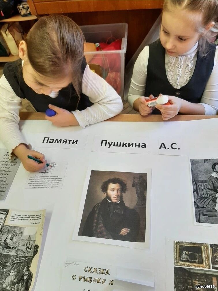 Ученики 1 "Г" класса начальной школы №615 на внеурочном занятии с классным руководителем, Кимбар Н.Ю., и воспитателем группы продленного дня, Бухаровой М.И., подготовили и провели коллективную творческую студию ко Дню памяти А.С. Пушкина.