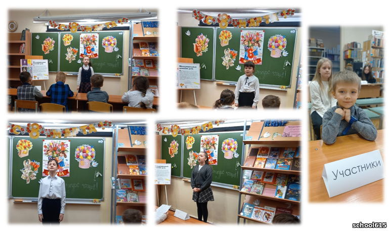 5 марта в библиотеке школы 615 проведён творческий конкурс чтецов "Разговор о маме", посвященный международному женскому дню 8 Марта.