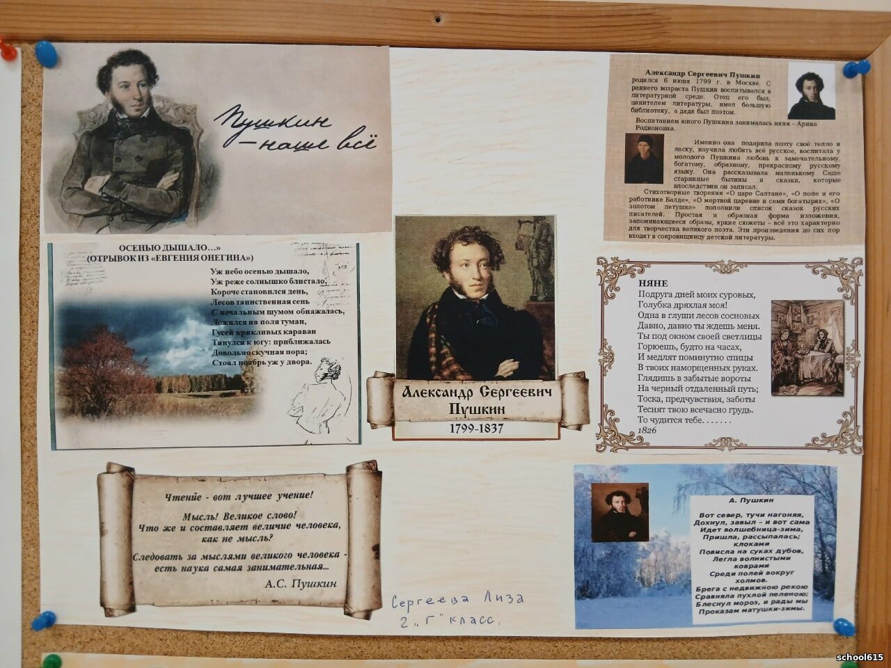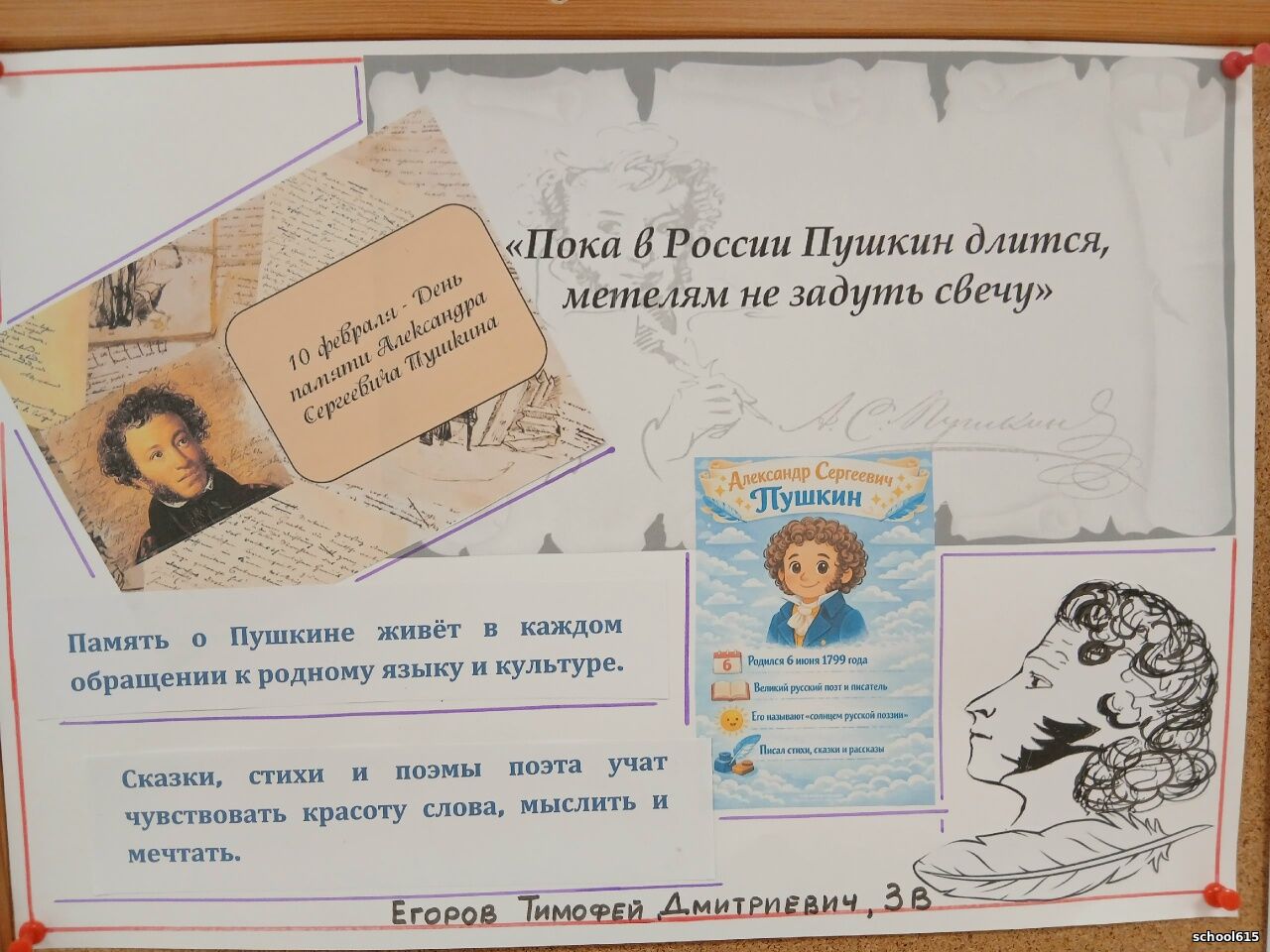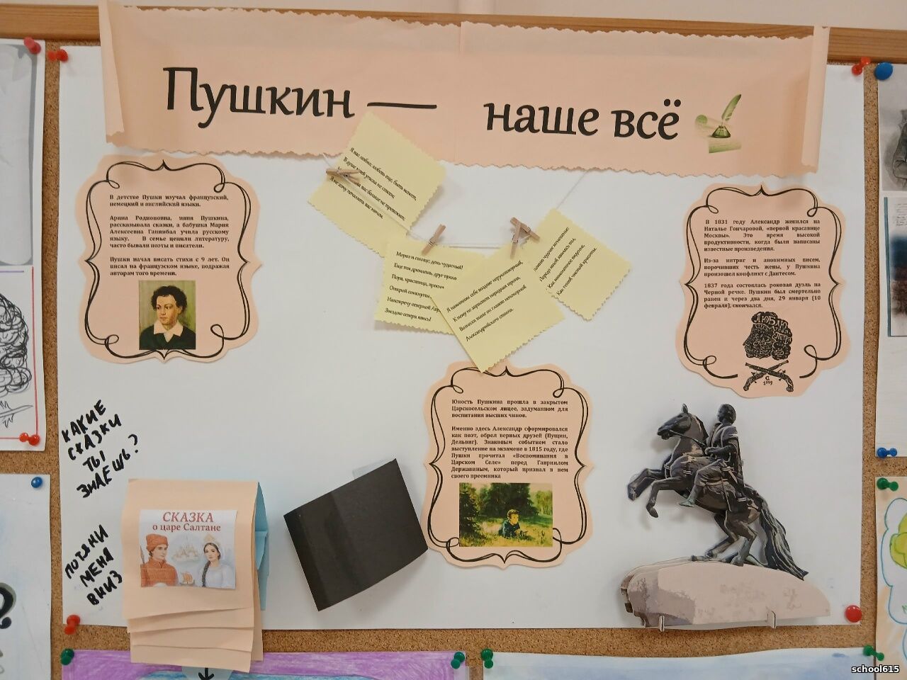 По традиции в феврале месяце в начальной школе №615 проходил конкурс рисунков и стенгазет, посвящённый Дню памяти А.С. Пушкина. Учащихся 1-4 классов нашей школы с вдохновением и энтузиазмом приняли участие в конкурсе рисунков и стенгазет, ведь сказки А.С. Пушкина все знают и любят все дети с малых лет.