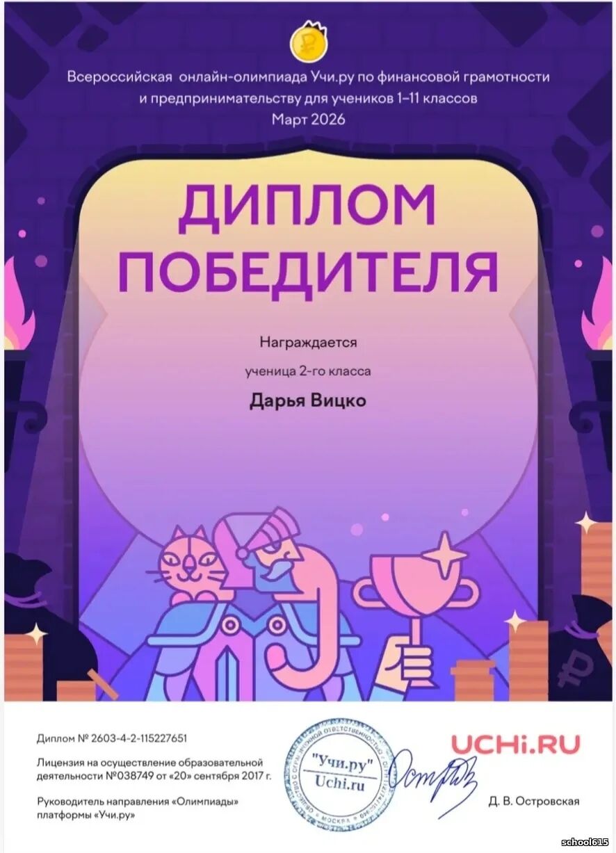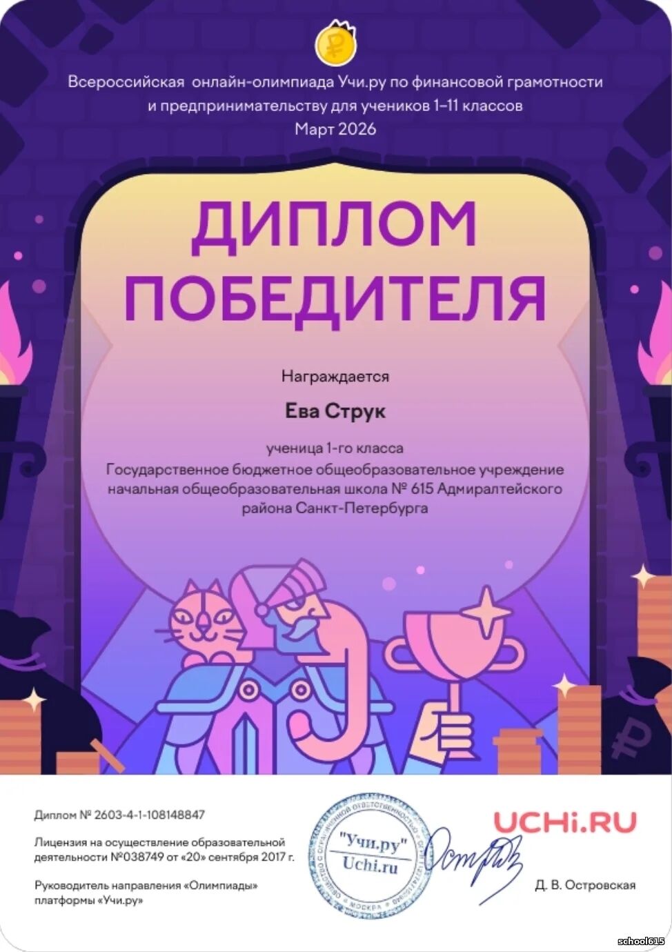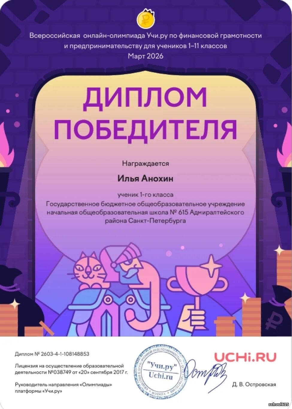 Ученики начальной школы №615 приняли активное участие во всероссийской онлайн-олимпиаде по финансовой грамотности и предпринимательству на платформе «Учи.ру».